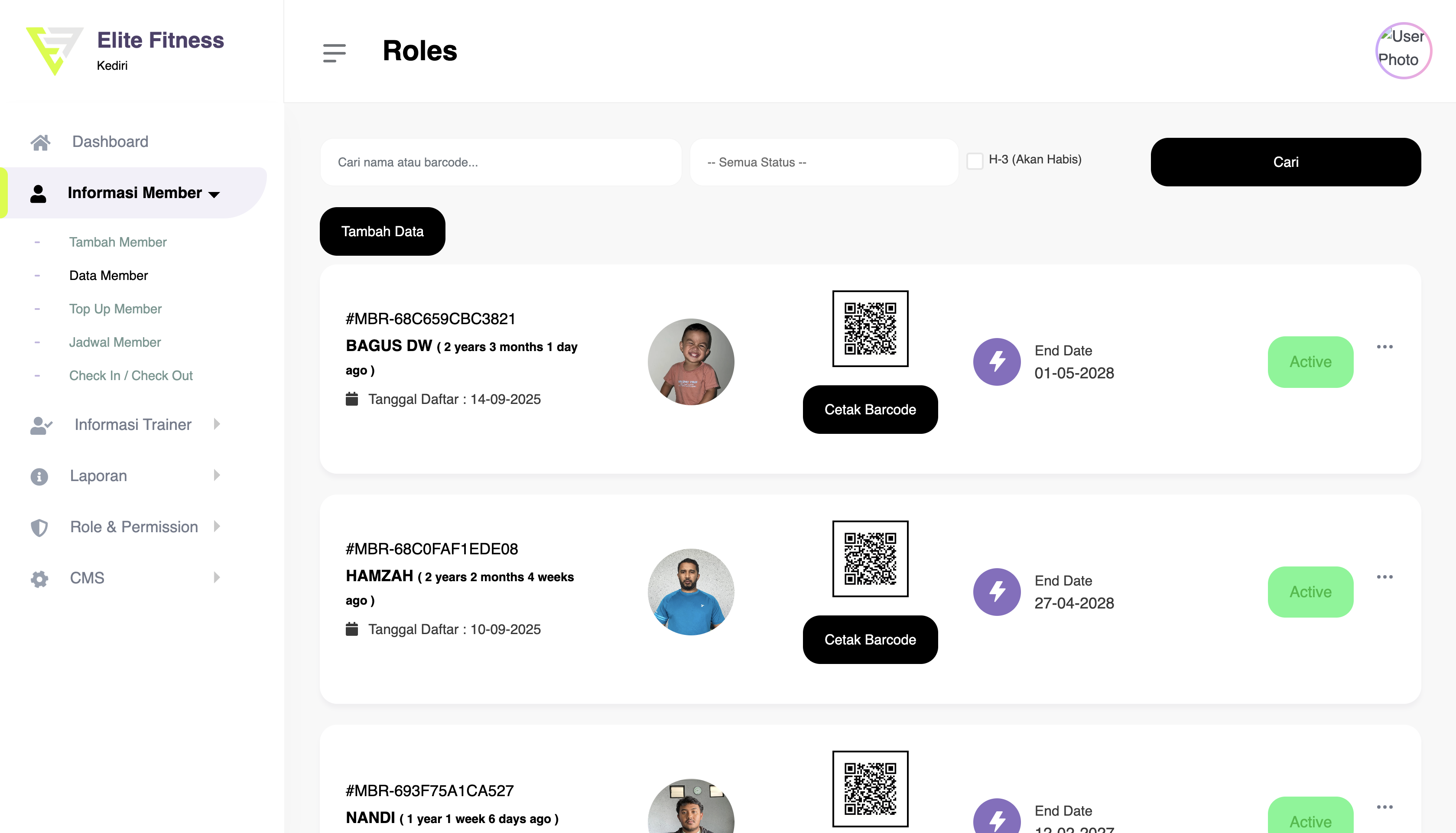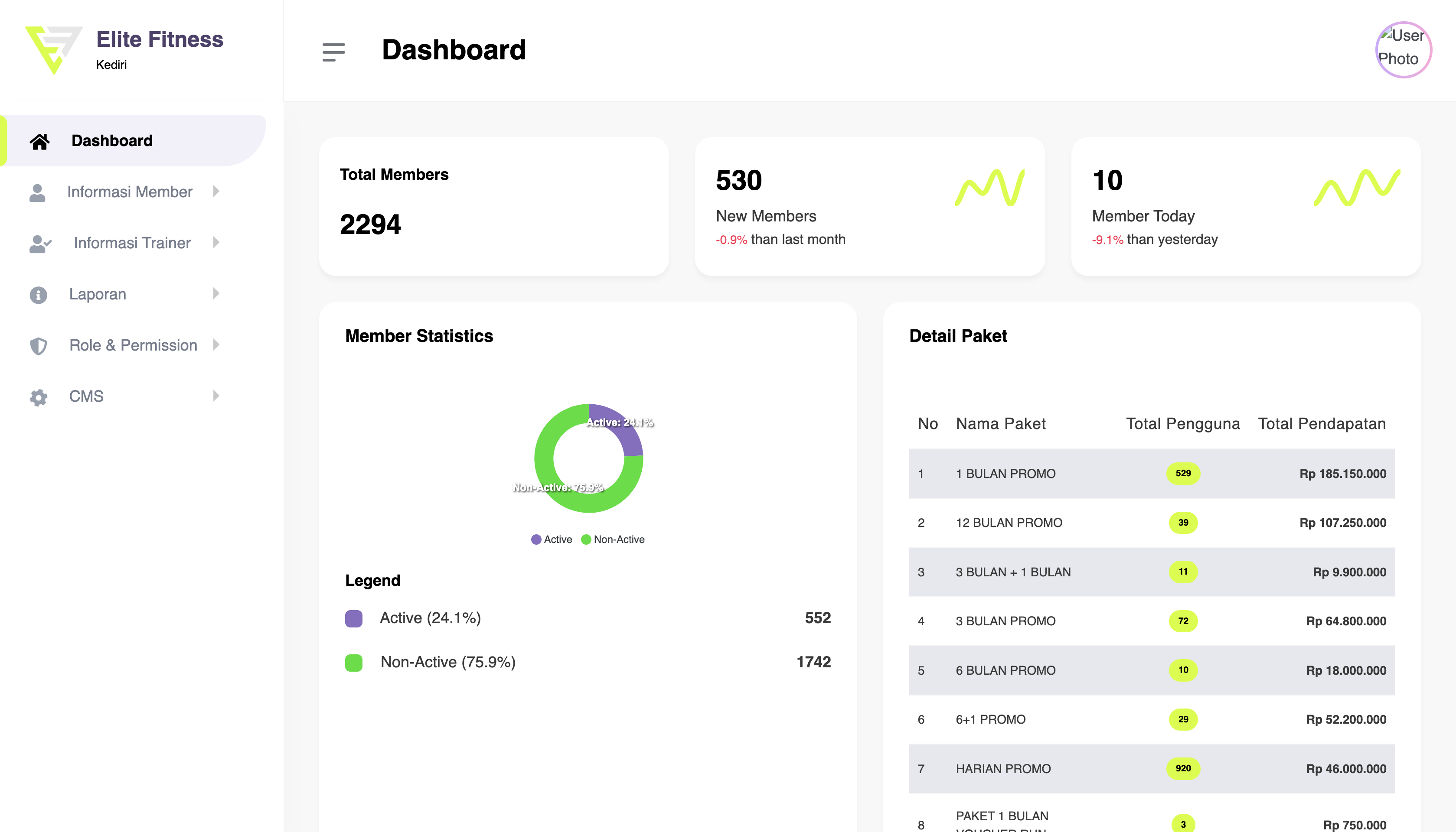Platform manajemen gym berbasis web untuk mengelola member, paket latihan, jadwal kelas, absensi, dan transaksi pembayaran dalam satu sistem terpusat. Sistem mendukung multi-role user (admin, trainer, member), validasi keanggotaan otomatis, serta laporan kehadiran dan pendapatan yang memudahkan pengambilan keputusan bisnis.
